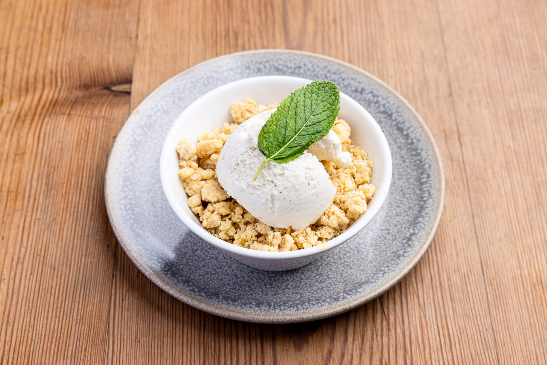 Hot apple crumble with vanilla ice cream and a toffee drizzle.