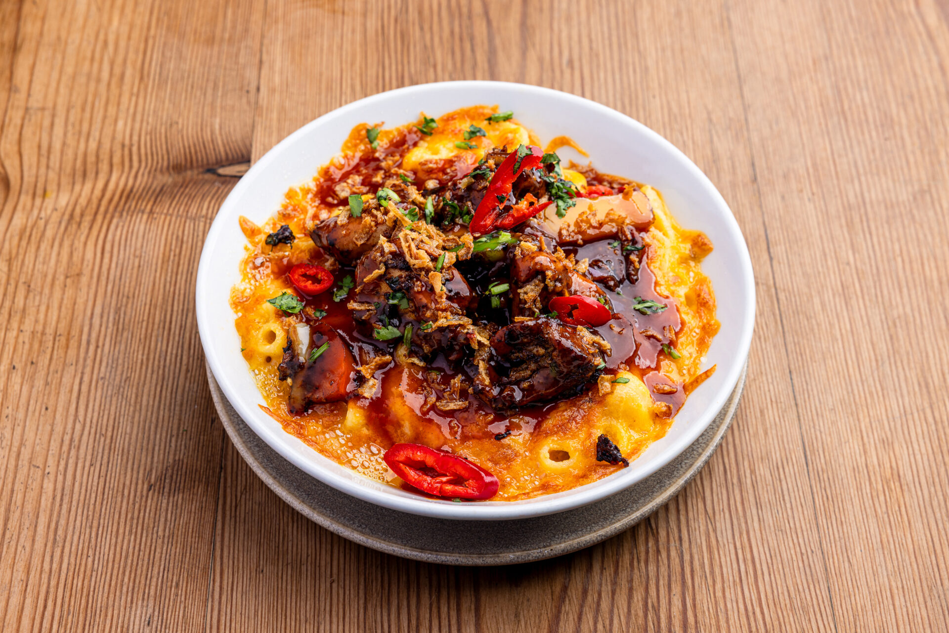Creamy Caribbean style mac n cheese loaded with Jerk chicken, BBQ gravy, crispy shallots, coriander and chillies and plantain. (Allergens: soya, celery, mustard, gluten, eggs)
