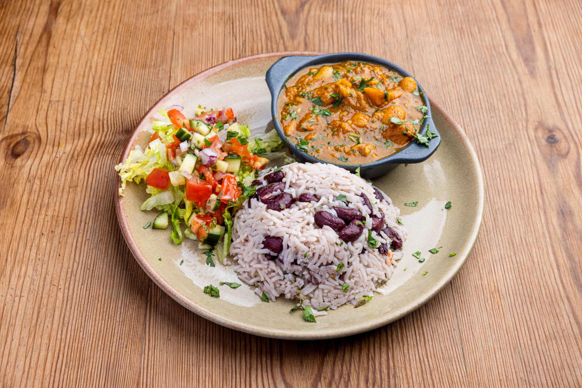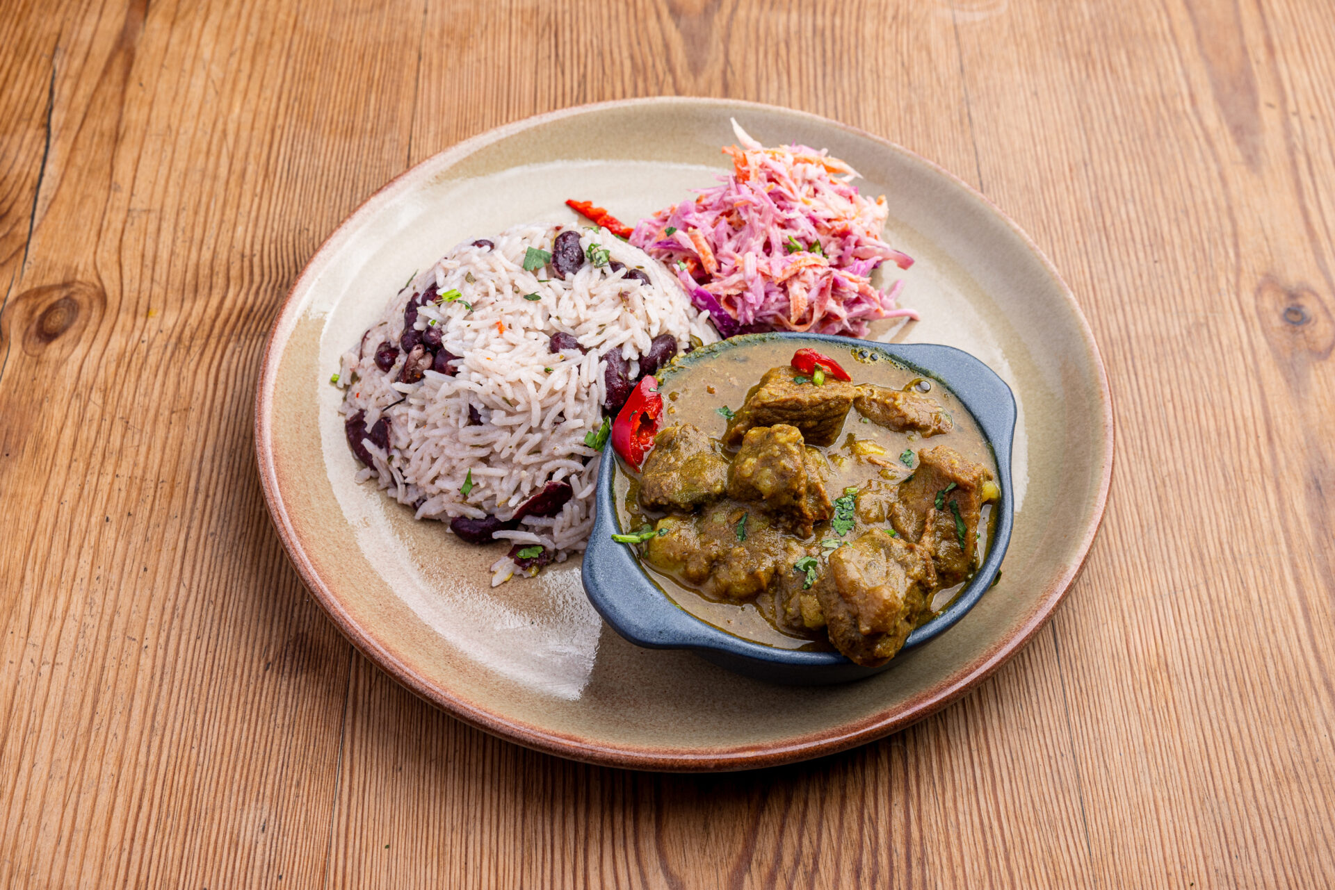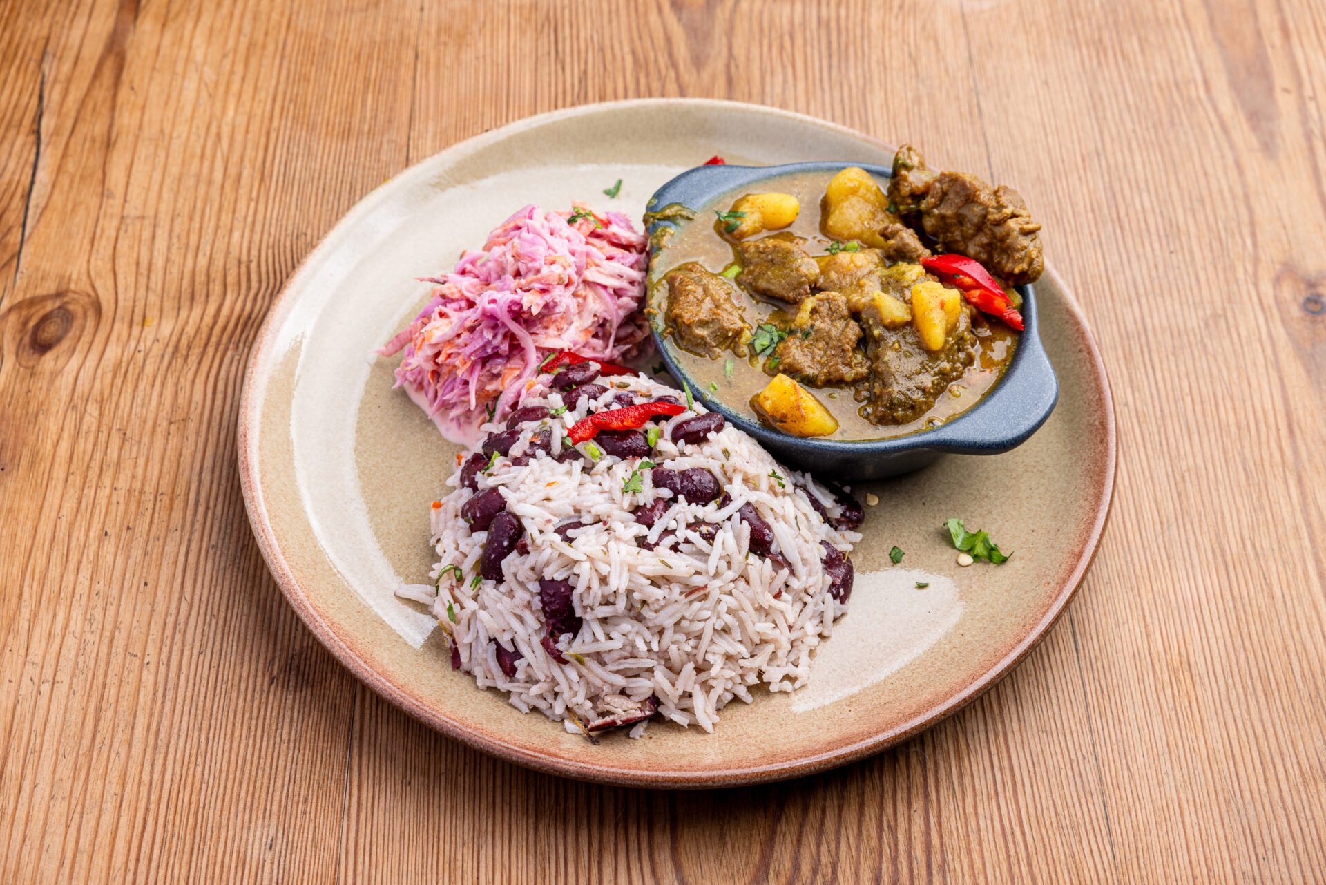 Tender slow cooked oxtail simmered in rich caribbean spiced stew sauce served with rice n peas and rainbow salad.