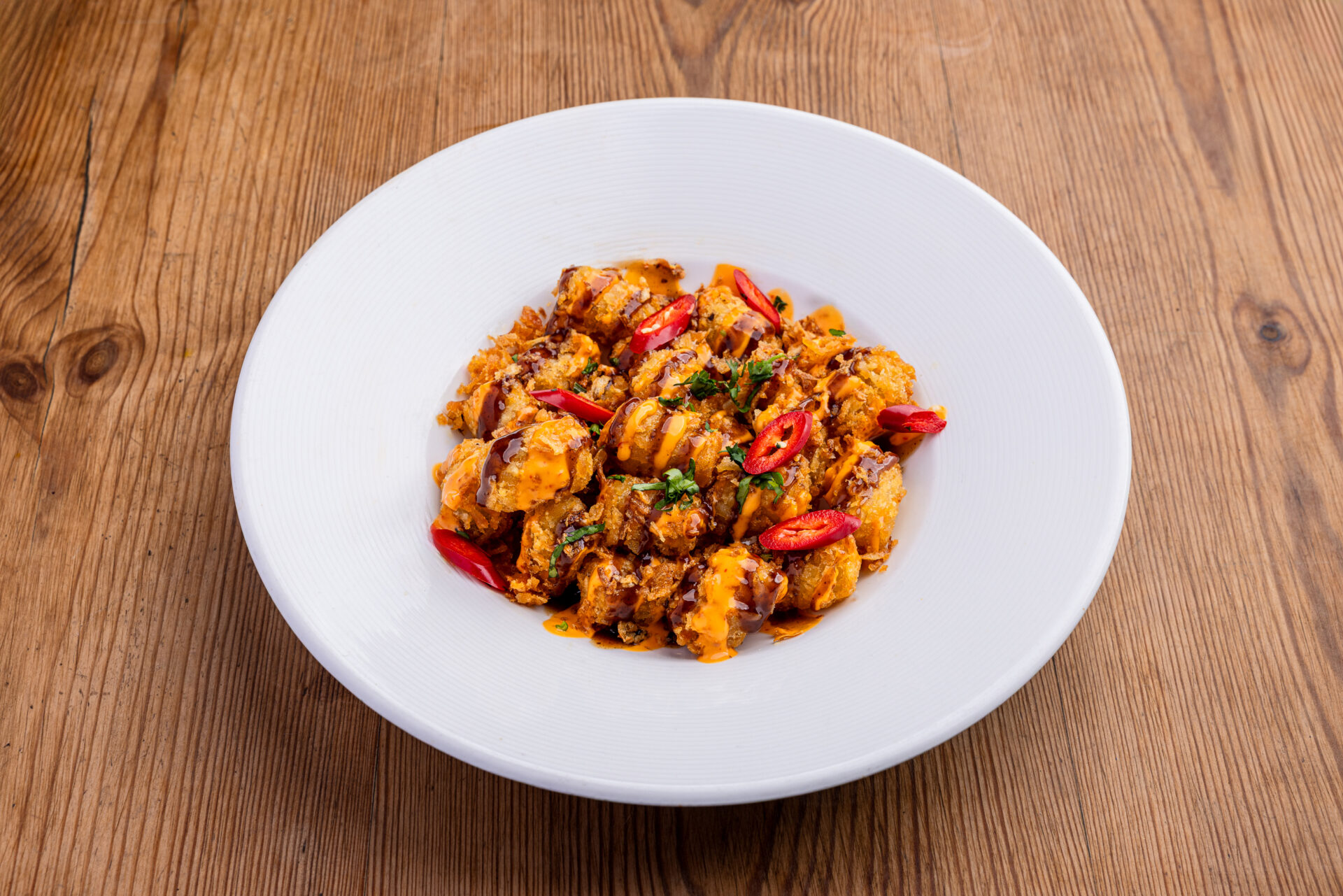 Sweet corn ribs tossed in spicy in garlic and chili rub with a hint of lime with Scotch bonnet mayo (GF)